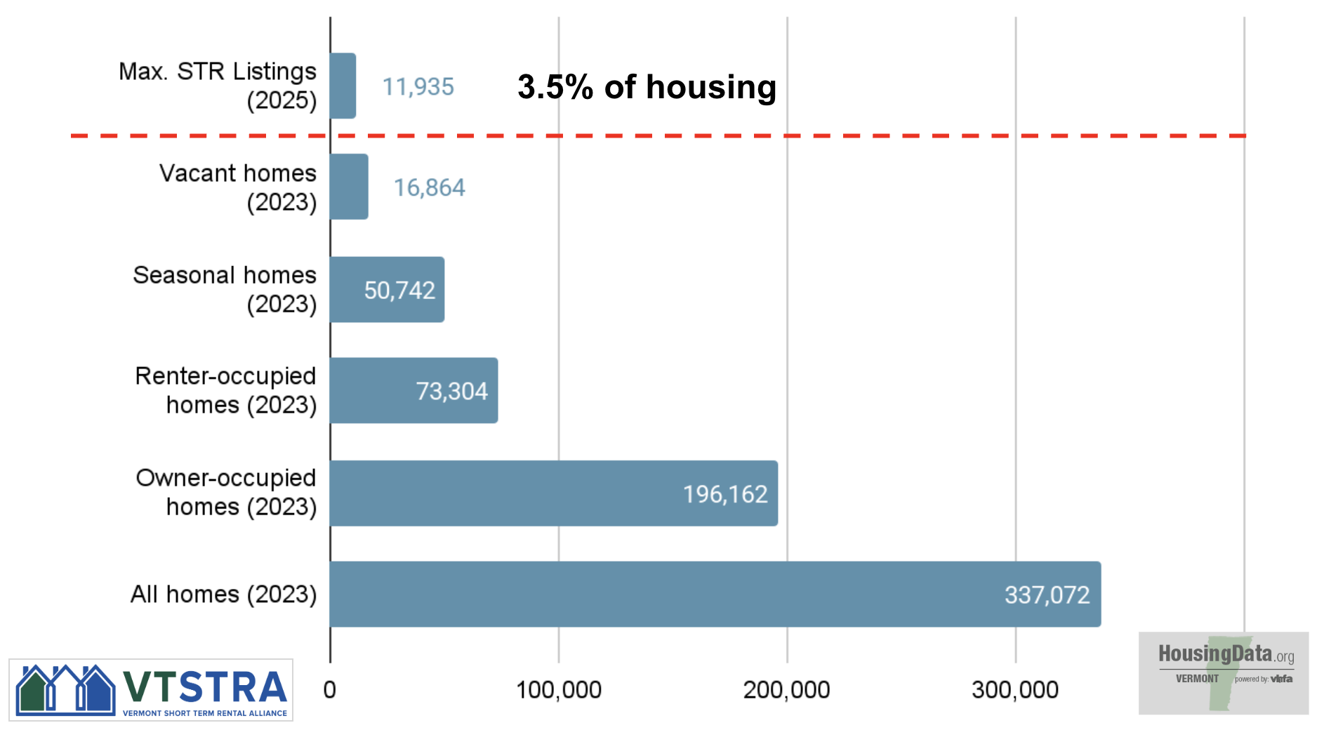 Peak “whole-home” STR listing represent 3-4% of Vermont’s housing stock. Includes owner-occupied homes and ADUs.