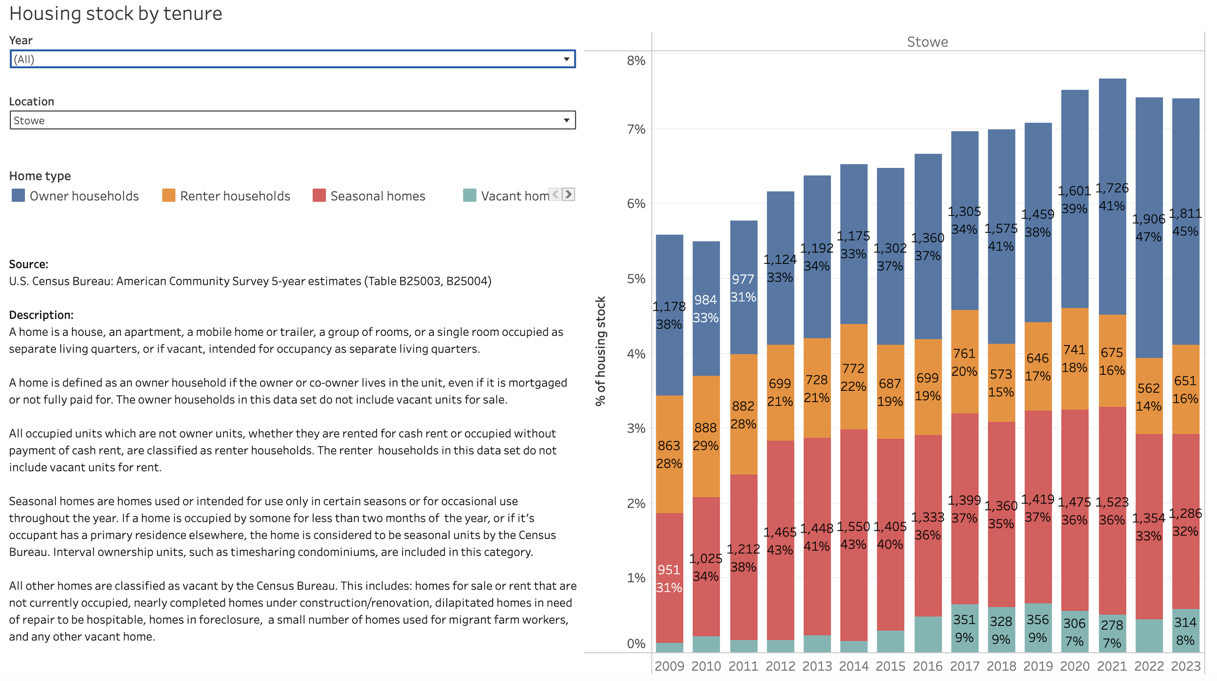 According to housing stock data published by the Vermont Housing Finance Agency (VHFA), Stowe’s number of owner-occupied homes is at its highest level since 2010, while second homes are at their lowest point over the same period.
